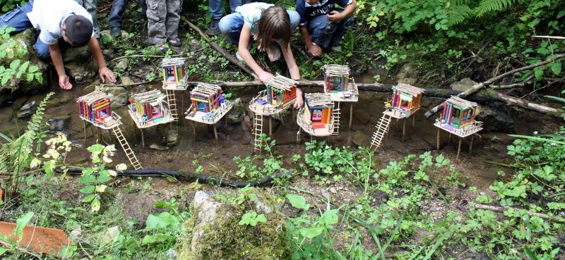 Proponuję wspólne budowanie domu na palach. Gotową konstrukcję możemy ustawić w małym jeziorku (czyli wykopanym przez dzieci dołku wypełnionym wodą).